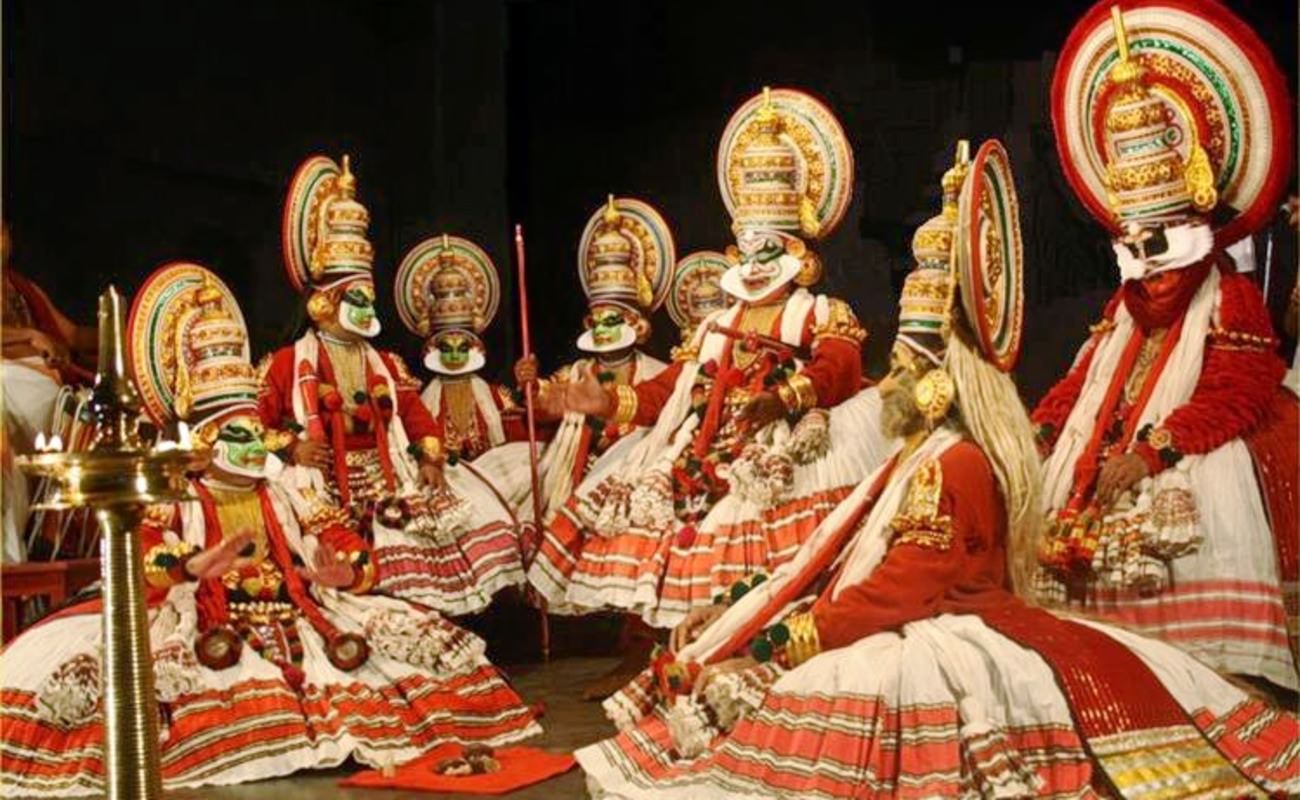 El Kathâkali o “historia actuada” se origina, según la tradición, cuando el Raja de Kottarakkara, enfadado porque un rey vecino no permitía a sus artistas representar en su corte, decidió crear una forma de arte autóctona en malayálam. Esta escuela tiene sus propios hasta o gestos y su maquillaje se inspira en las máscaras de los demonios drávidas del período pre-hindú. Sus temas se basan en el Râmâyana, el Mahâbhârata, el Shiva Purâna y el Bhâgavat Purâna principalmente. Suele tratar del conflicto entre las fuerzas primigenias del bien y el mal y por el vigor que requiere sólo lo interpretan hombres. Los principales personajes son pachcha, el héroe, de color verde; katti, un malvado violento; chogannatari, otro malvado, con barba roja; vellupputari, representación de Hanuman, con barba blanca; karupputari, un cazador o bosquimano, con barba negra; kari, brujas u ogros, de color negro, y minnukku, sabios, brahmines y mujeres.