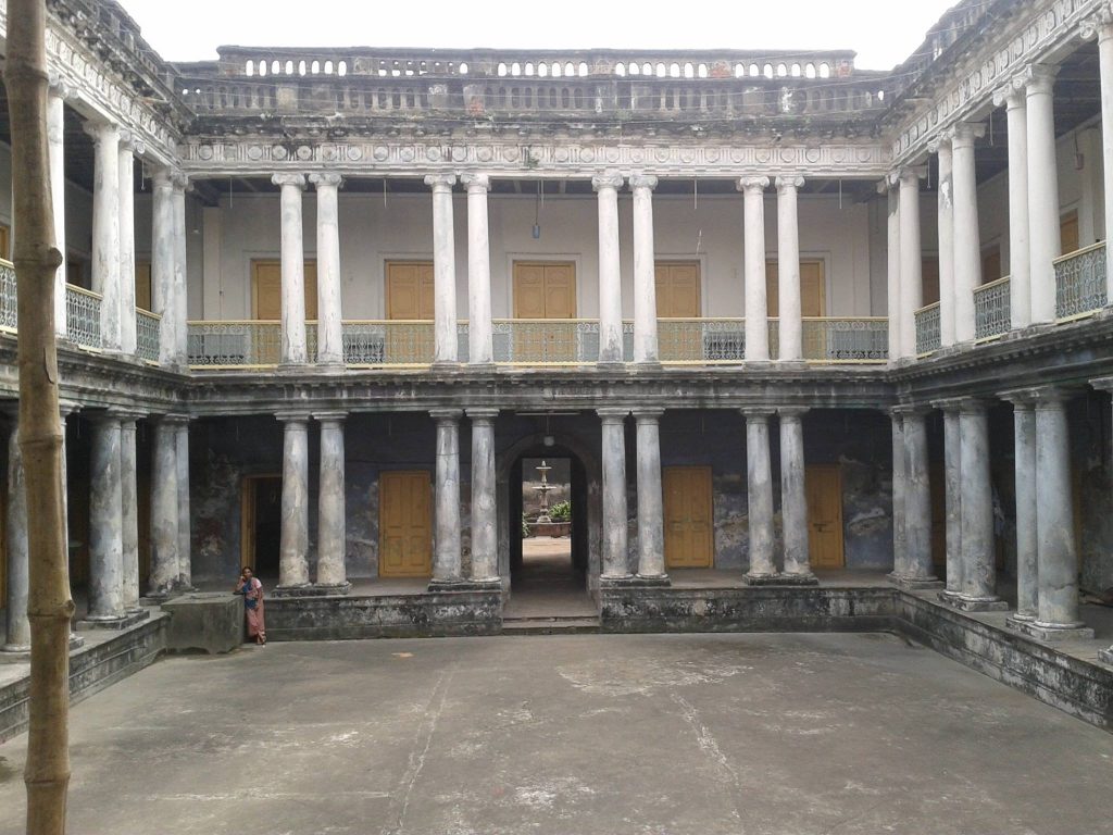 La parada siguiente es Naya Bazaar Mullick Bari, que representa las típicas tendencias arquitectónicas del siglo XIX en Bengala. La fachada es de estilo clásico dórico/palladiano y neoclásico, con columnas corintias acanaladas. A diferencia de los edificios británicos de ladrillo rojo y piedra arenisca de Calcuta central, las casas bengalíes tienen mezcla de cal en las columnas y muros. Kaustabh Mullick. el propietario actual, me muestra el lugar. En un extremo del patio interno está el thakur dalan, junto al cual hay una estatua de mármol de una diosa griega. «Mi ancestro Nabdalal fue zamindar (terrateniente)», afirma Kaustabh.